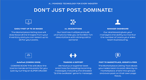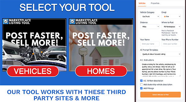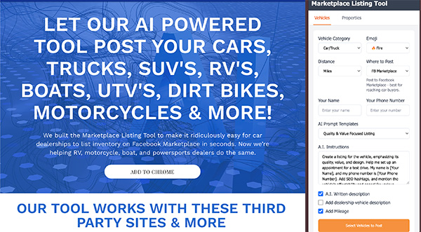• Automated postings of vehicles and properties to Facebook Marketplace, groups, and personal feeds.