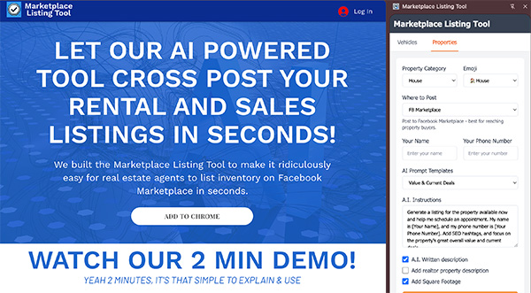 The tool, available at www.marketplacelistingtool.com, allows users to post cars, homes, boats, RVs, or any real estate property directly to Facebook Marketplace, groups, or personal feeds in seconds.
