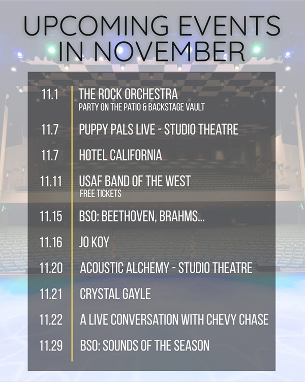 The festivities begin November 1 with The Rock Orchestra’s Party on the Patio and Backstage Vault. November highlights include the energetic Puppy Pals Live and the Hotel California tribute on November 7, followed by a special free concert from the U.S. Air Force Band of the West on November 11.