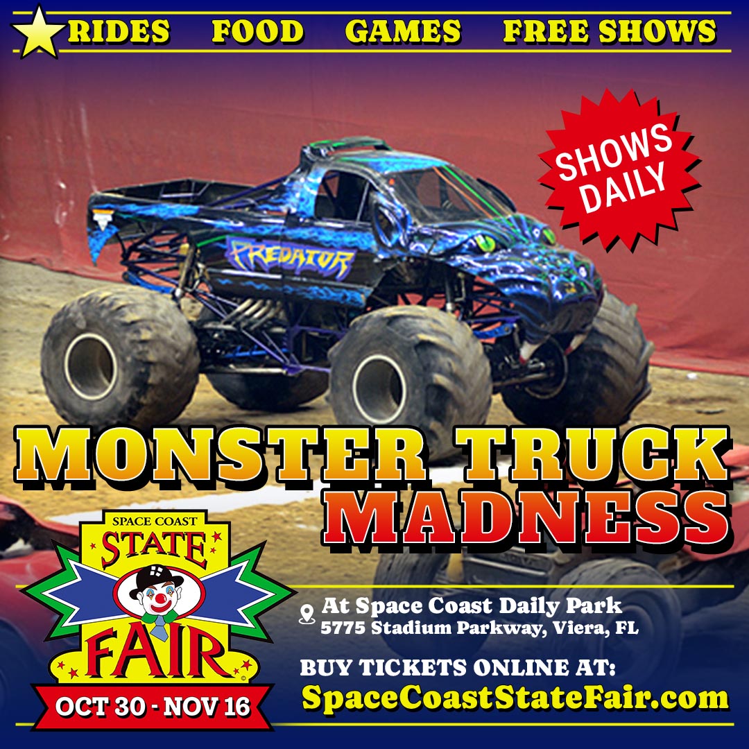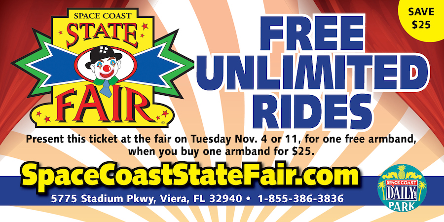 Enjoy unlimited rides and funnel cakes at the 40th Annual Space Coast State Fair, now through November 16th at Space Coast Daily Park in Viera. $10 admission includes nine free shows featuring monster trucks, pro wrestling, a haunted house, and more! Visit SpaceCoastStateFair.com for details. GET ADVANCED TICKET DISCOUNTS HERE