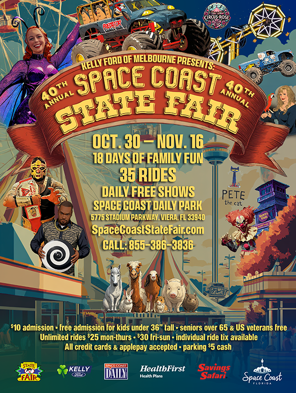 The Space Coast State Fair will be held from October 30 to November 16, at the Space Coast Daily Park located at 5775 Stadium Parkway in Viera.