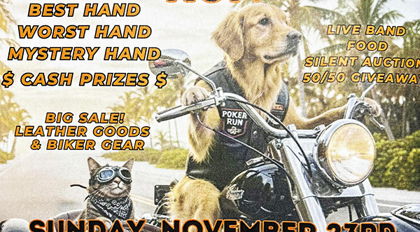 Participants can join the ride for $10 per hand in this poker-style run, with opportunities to win cash prizes for the best hand, worst hand, and mystery hand. Riders who bring a pet food or supply donation will receive a free card at the end of the run.