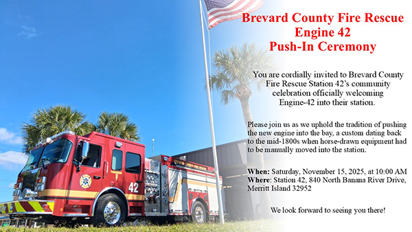 BREVARD COUNTY, FLORIDA – Brevard County Fire Rescue Station 42 will celebrate a proud firefighting tradition with a community event welcoming their newest fire engine – Engine 42, with a Push-In Ceremony on Saturday, November 15, at 10 a.m. at Station 42, located at 840 North Banana River Drive in Merritt Island.