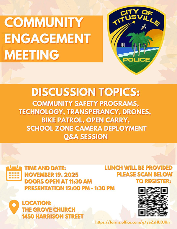 BREVARD COUNTY • TITUSVILLE, FLORIDA – The Titusville Police Department will host a Community Engagement Meeting on November 19, at The Grove Church located at 1450 Harrison Street.